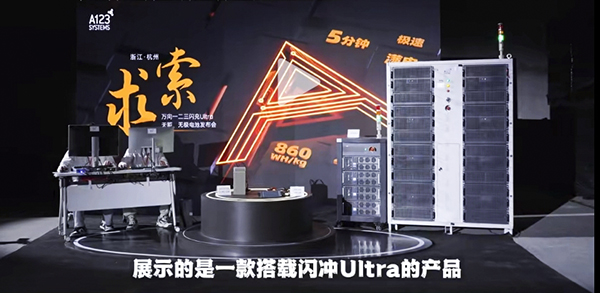 星云150V 400A模組充放電測(cè)試系統(tǒng)(右一)、星云10V300A電芯充放電測(cè)試系統(tǒng)(右二)出現(xiàn)在萬(wàn)向一二三12C超高倍率“閃充Ultra電池”發(fā)布會(huì)視頻中